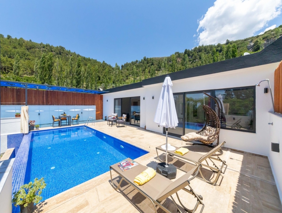 HAVUZ TERASI: Özel yüzme havuzu, yemek masası ve sandalyeler, mangal, şezlong ve salıncak bulunmaktadır.